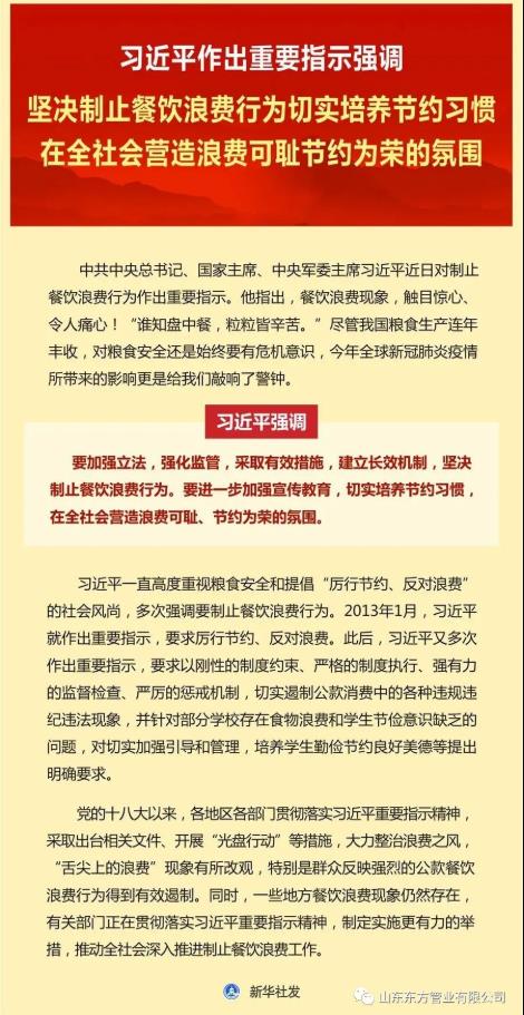 山東東方管業(yè)有限公司將帶頭認真貫徹落實習(xí)總書記重要指示精神,把勤儉節(jié)約當(dāng)作“傳家寶”,堅持從小事做起、從自身做起、從現(xiàn)在做起,堅決抵制“舌尖上的浪費”,反對奢靡之風(fēng),摒棄盲目攀比,切實以自身的行為促使“厲行節(jié)約、反對浪費”蔚然成風(fēng)。